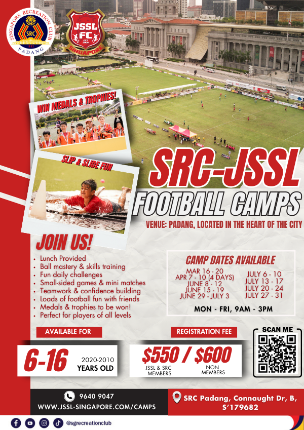 Looking for an exciting way to keep your young footballers active this school holiday? The SRC–JSSL Football Camps bring together professional coaching, engaging challenges and plenty of match play at the iconic Padang in the heart of the city.