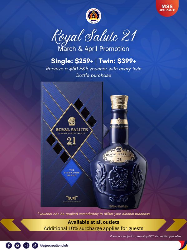 Available this March and April at all outlets, enjoy Royal Salute at special promotional prices.With every twin bottle purchase, receive a $50 F&B voucher. While stocks last!